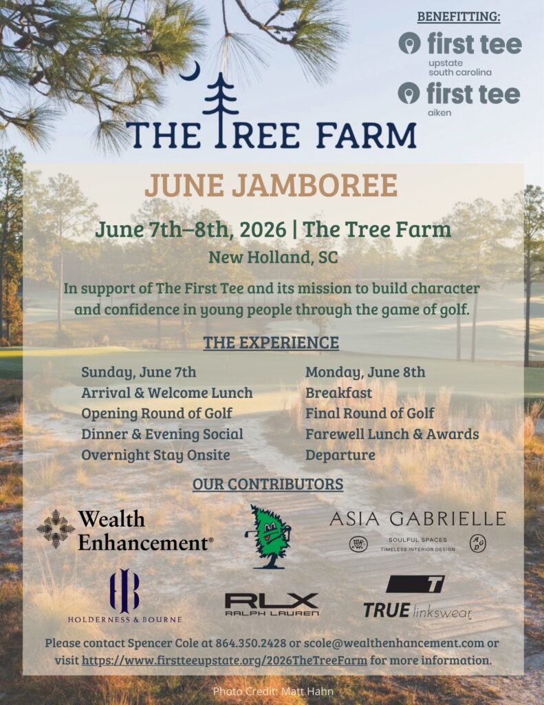 The June Jamboree at The Tree Farm is a one‑of‑a‑kind charitable experience benefitting First Tee — Upstate South Carolina and First Tee — Aiken, offering guests an unforgettable program of world‑class golf, exceptional cuisine, and genuine hospitality. Participants will enjoy lunch‑to‑lunch meals, two rounds of golf, and an overnight stay on one of the most celebrated properties in this era of modern golf—an environment renowned not only for its standout course design but also for its outstanding culinary program and warm, attentive guest services. During The June Jamboree participants will not only experience this celebrated club firsthand—they’ll also enjoy an elevated gift packages and contest prizes provided by premier partners Holderness & Bourne, RLX, and TRUE linkswear. You can register in whatever way suits you best—bring a partner or a full foursome and request your preferred pairing, or sign up solo and let us match you with other First Tee supporters.