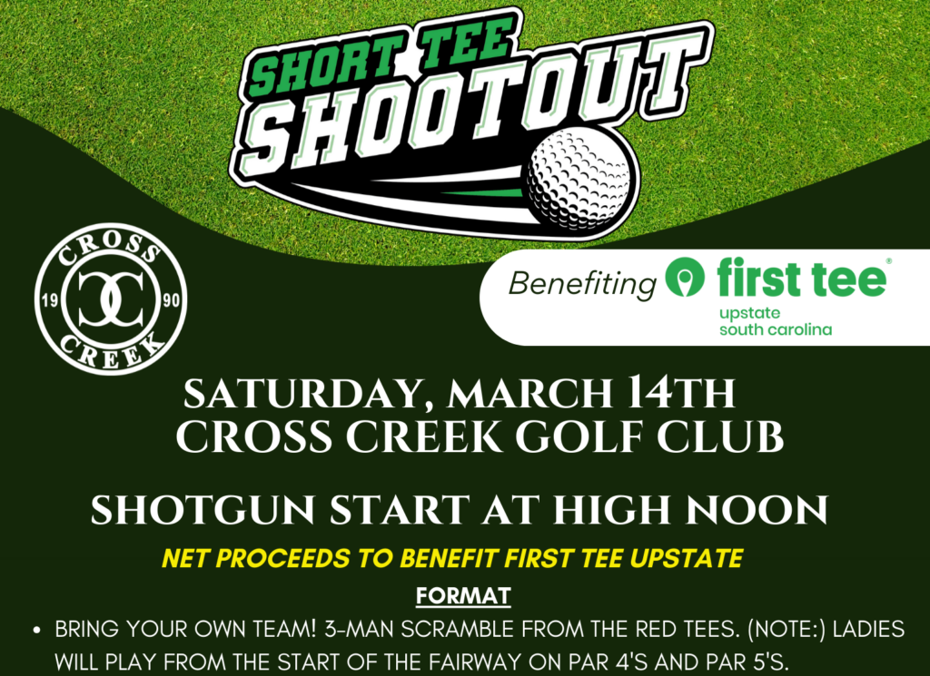 Join us for the Short Tee Shootout on Saturday, March 14, 2026. The event will feature a fun format with a shotgun start at high noon, with net proceeds benefiting First Tee — Upstate South Carolina. For more information regarding the tournament, please click the button below.
