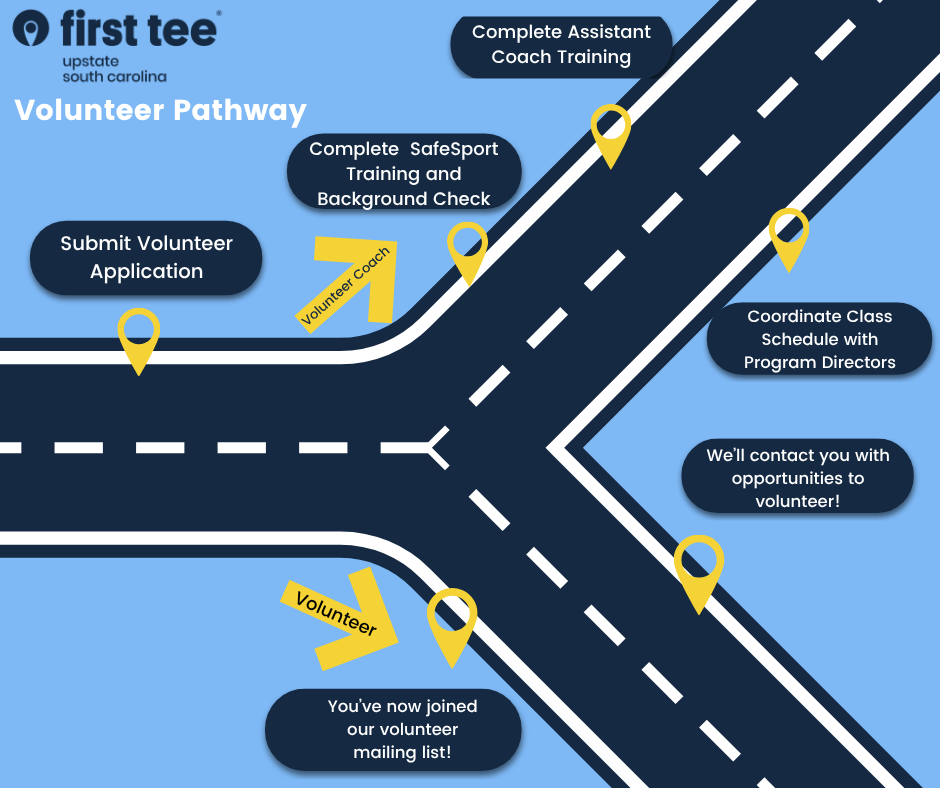 First Tee — Upstate South Carolina is dedicated to helping young people build character, confidence, and life skills through the game of golf. By joining our team, you play an important role in creating fun, safe, and impactful experiences for our participants while helping our chapter thrive. We’re always in need and grateful to anyone who would like to volunteer their time or talents. Our programs are successful due to the support of dedicated coaches and volunteers. We welcome people who can help in all areas, including coaching, assistant coaching, administration and assistance with special events. You don’t need to have experience as a golfer or in the golf industry to make a positive contribution to our efforts.